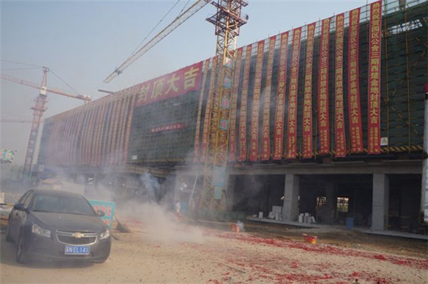 11月20日上午9:58,在隆隆的鞭炮聲中,園區(qū)公舍三期西楚金地項(xiàng)目主體工程順利封頂。