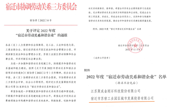 近日,園區(qū)城發(fā)公司獲評(píng)2022年度“宿遷市勞動(dòng)關(guān)系和諧企業(yè)” 榮譽(yù)稱號(hào)。