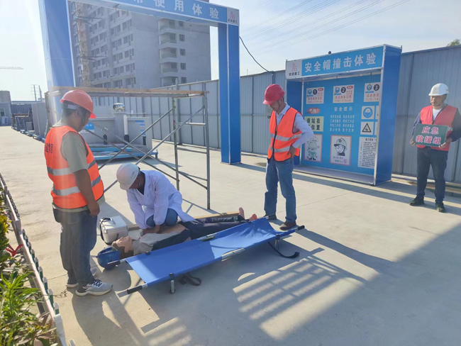 此次演練模擬一名內(nèi)墻抹灰人員在場地上行走, 突然有木方從高處墜落,造成物體打擊?,F(xiàn)場立即撥打120請求救援,同時立即通知各救援小組趕赴現(xiàn)場啟動應急預案,停止現(xiàn)場施工作業(yè),封鎖事故現(xiàn)場,注意保護好受傷人員,防止造成二次傷害。隨后,120救護車在救援組人員的帶領(lǐng)下來到工地,直接進入事故現(xiàn)場,檢查傷員受傷情況。經(jīng)醫(yī)護人員包扎處理后,受傷人員被迅速用擔架抬上救護車,并送往醫(yī)院進行救治。