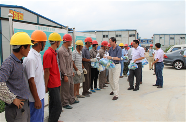 8月11日上午,園區(qū)黨工委委員、規(guī)劃建設(shè)局局長(zhǎng)周原帶隊(duì)來(lái)到夢(mèng)家園、許莊變、2014年市政二標(biāo)等項(xiàng)目工地,檢查防暑降溫措施落實(shí)情況,并慰問(wèn)奮戰(zhàn)在高溫一線(xiàn)的建筑工人。